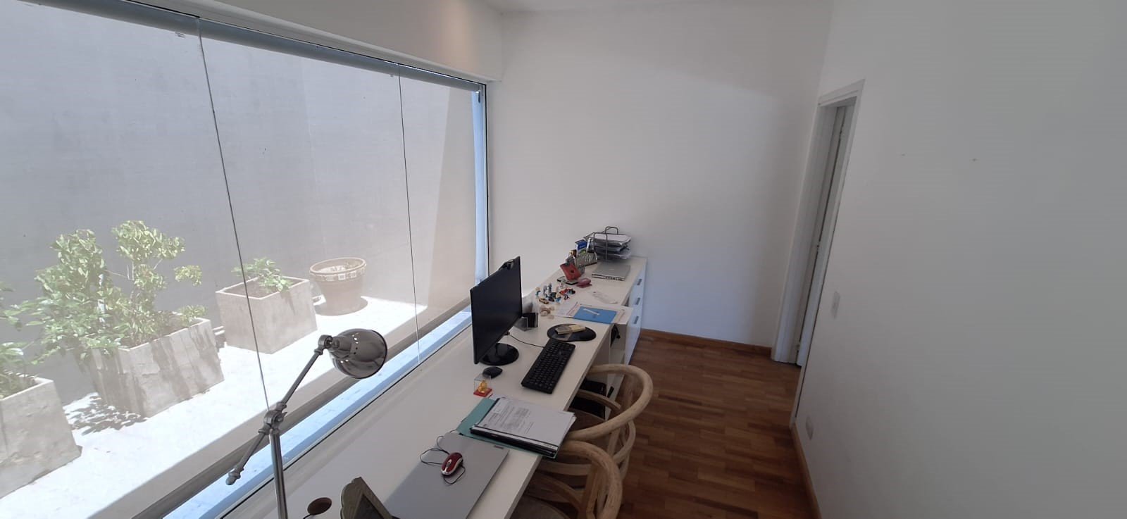 Escritorio iluminado con acceso a pequeña terraza accesible.