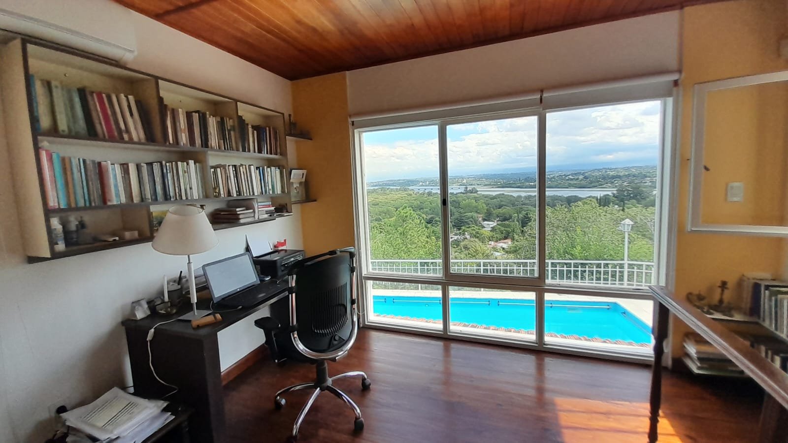 Cuando despartas en uno de sus tres dormitorios ves lago, paisaje, sierras. Después escribís y soñas en ese estudio todo vidriado, con el crepitar  de las llamas de la chimenea anunciando el invierno que pronto llegara.